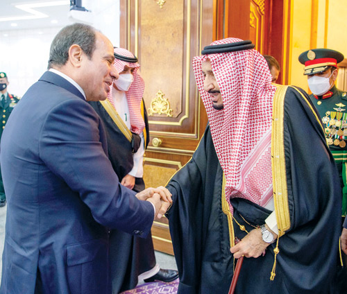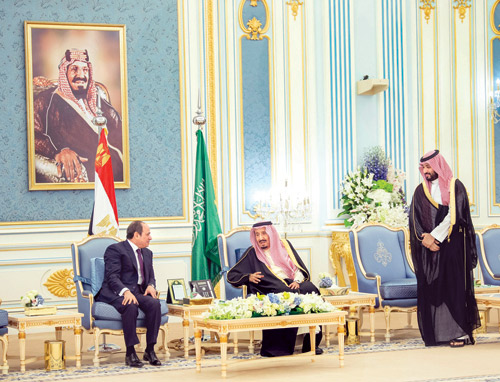 استقبل خادم الحرمين الشريفين الملك سلمان بن عبد العزيز آل سعود - حفظه الله - في قصر اليمامة بالرياض أمس فخامة الرئيس عبدالفتاح السيسي رئيس جمهورية مصر العربية، بحضور صاحب السمو الملكي الأمير محمد بن سلمان بن عبدالعزيز ولي العهد نائب رئيس مجلس الوزراء وزير الدفاع.
