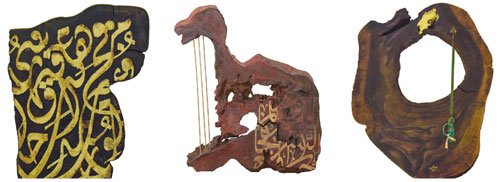 لم تزل التجربة الجديدة تتداعى في سياق اهتماماته الاثيرية بالاشتغال على الخامة، وهي خامة يلتقطها من الشارع او من مبنى قديم وربما يسعى الى تشكيلها لتتوافق ورؤيته الجديدة وتحقيق فكرته الآنّية، فأكثر الخامات اشتغالا هي الأخشاب والتي تبدي في هيئتها او توحي في بعضها بالواح الكتاتيب، كما ويسعى الى الإيحاء بفعل زمني (مهذّب) لتتلاءم وكتاباته التي يمهرها بقواعد الخط العربي او قريبا من ذلك، موظفا الذهبي للايحاء بالقيمة والمعنى، وإحساسه بعلاقات الحروف والكتابة والاشتغال على المساحة التي أرادها تشكيلا وإيحاء بزمن تعمق من المعنى والدلالة. هو يبني عمله مكتفيا بالخامة بين طبيعتها والاشتغال على تهيئتها لتحقيق انشاءاته الفنية وتأكيد فكرته، والكتابة وان لم تبعث معنى مباشرا إلا أنها تمنح القطعة حيوية وتمازجاً بين الطبيعي وقوانين الكتابة. تتنوع الخامات وتنشأ بما تقتضيه مراجعة الفنان للفكرة، فهو يحدد رؤيته الفنية بين علاقات إنسانية من جانب، وعلاقة ذاتية بين حالات يؤكدها في منشور معرضه، بين تصالح الإنسان ونفسه واثر ذلك على علاقته بالآخرين وبالمحيط والمجتمع، وعموم البشرية. هو هنا يترك أثرا ماديا ينبني على المواد والخامات التي يصنعها او يأتي بها على طبيعتها مثلما يستعير مصنوعاته للمساحات المستطيلة التي تشي بباب او حائط يبعث شيئا من الضوء الذي يتمثل في إشعاع داخلي ترسمه الحروف المكتوبة والتي عالجها بما يحقق انبعاث ضوء جلي ونافذ على غرار النفس التي تترك اثرها على الاخرين، هي النفس التي نقول بنقائها وصفائها.