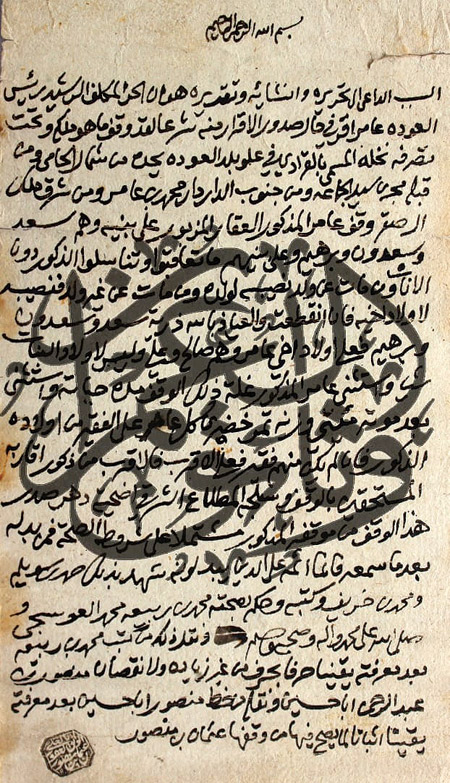 ونقل ذلك من كتب محمد بن ربيعة بعد معرفته يقيناً حرفاً بحرف من غير زيادة ولا نقصان، منصور بن عبدالرحمن أباحسين ونقله من خط منصور أباحسين، بعد معرفته يقيناً إثباتاً لما يصح فيها من وقفها عثمان بن منصور. (ختم: الواثق بالعلي الغفور عثمان بن منصور).