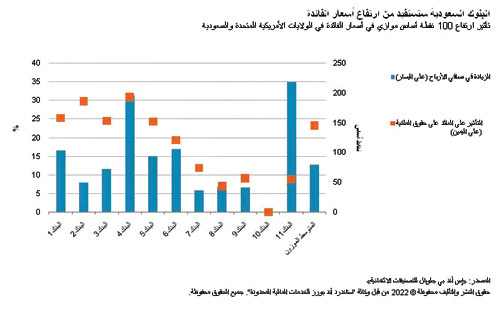 ستؤدي هذه التغييرات إلى زيادة أرباح البنوك السعودية بسبب هيكل ميزانياتها العمومية. ومع ذلك، فإن ذلك يعتمد على فرضية أن التحول في منحنى العائد متوازٍ، وأن تبقى الميزانيات العمومية للبنوك ثابتة. يمكن أن تنشأ آثار ثانوية من الزيادة في أسعار الفائدة من ارتفاع تكلفة التمويل وتباطؤ النمو الائتماني بوتيرة أبطأ من المتوقعة. وقالت الوكالة، إنه وفقاً لحساباتنا، مقابل كل زيادة قدرها 100 نقطة أساس في أسعار الفائدة، من المرجح أن يرتفع صافي دخل البنوك السعودية بنسبة 13% وأن يرتفع العائد على حقوق الملكية 1.5 نقطة مئوية إضافية، وفقاً لبيانات من البنوك العشرة المدرجة في المملكة .