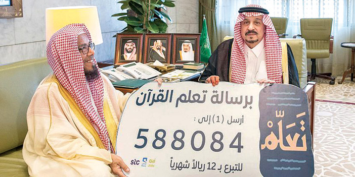 دشّن صاحب السمو الملكي الأمير فيصل بن بندر بن عبدالعزيز أمير منطقة الرياض في مكتبه بقصر الحكم أمس حملة مشروع «وقف تعلم للقرآن وعلومه بالرياض»،وذلك خلال استقباله رئيس مجلس إدارة جمعية المركز الخيري لتعليم القرآن الكريم وعلومه «تعلم» معالي الشيخ الدكتور عبدالله بن محمد المطلق وأعضاء الجمعية. وبيّن الشيخ المطلق أن الحملة تهدف إلى تغطية تكاليف مبنى وقف تعلم للقرآن الكريم و علومه الذي سيخدم أبناء وبنات هذا الوطن المعطاء. كما دشّن سمو الأمير فيصل بن بندر حملة التبرع بالرسائل النصية «برسالة تعلم القرآن» عن طريق استقطاع مبلغ 12 ريالاً شهريًا بإرسال رقم (1) إلى 588084. واطلع سموه على التقرير السنوي للجمعية تحت عنوان» 40 عاماً في خدمة القرآن الكريم وعلومه» متضمناً منجزات الجمعية ومستجداتها،منوهاً سموه بالجهود التي تقوم بها الجمعية لدعم تعليم القرآن الكريم وعلومه. وتسلّم سموه في نهاية الاستقبال هدية تذكارية بهذه المناسبة.