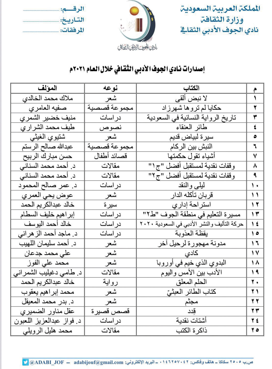 أوضح رئيس نادي الجوف الأدبي الثقافي عبدالعزيز النبط أن النادي أصدر 25 كتاباً خلال عام 2021م، تناولت مجالات متعددة في الأدب والثقافة.