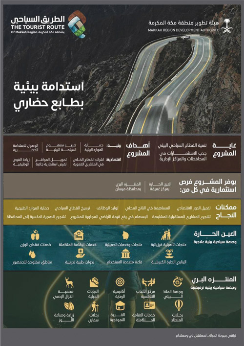 ولفت إلى أن المنطقة وإنسانها يعيشون اليوم قفزة كبرى، فمن ضمن المنجزات، وبدعم وتوجيه من رئيس مجلس الهيئة أمير المنطقة، كانت الهيئة قد أكملت في موسم الحج الماضي مشروع «مركز الضبط الأمني بالشميسي» لتغيير المشهد البصري في نقطة الأمن والفرز بالشميسي، وليكون هذا المشروع التطويري أنموذجاً مثالياً لمراكز الضبط والاستقبال في جميع مداخل منطقة مكة المكرمة بمواصفات ومعايير عالمية، مؤكداً مواصلة مبادرات الهيئة، حيث برزت مبادرة تطوير محور طريق الأمير محمد بن سلمان «مكة جدة السريع سابقًا»، الذي يعد أحد أهم طرق مدينة مكة المكرمة الحيوية، حيث ستُقام على امتداد الطريق حزمة من المشروعات التنموية المعززة بالتغذية البصرية بإشراف هيئة تطوير منطقة مكة المكرمة. ووصف مشروع الطريق السياحي بأنه الأكثر حيوية، وهو أحد مشاريع الهيئة، حيث لدينا عمل يشمل نطاقاً جغرافياً واسعاً يضم محافظات منطقة مكة المكرمة، الذي يهدف إلى اكتشاف وتهيئة الفرص، وبحث وتجهيز الممكنات من أجل عمل تكاملي يتوافق مع رؤية المملكة واستراتيجية المنطقة، ويعد المشروع أحد مخرجات استراتيجية المنطقة المتوائمة مع رؤية المملكة 2030، من خلال تطوير مجموعة من المواقع ذات المميزات الطبيعية والأثرية والحفاظ عليها وحمايتها، للوصول إلى تنمية مستدامة لقطاع السياحة البيئية في المنطقة؛ مشيراً إلى أن نطاق أعمال المرحلة الأولى للمشروع تشمل تطوير عدد من المواقع المختارة ذات الميز النسبية، بالإضافة إلى استكمال عدد من الطرق الحيوية جنوب المنطقة وشمالها ضمن مسار المشروع المحدد، وذلك بالتعاون مع الجهات والقطاعات ذات العلاقة.