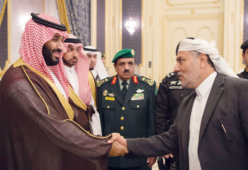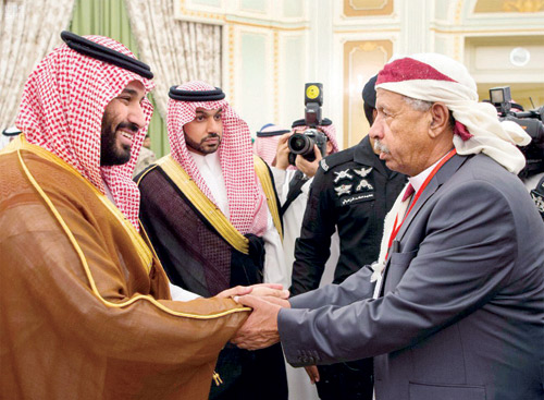 وقد ألقى سمو ولي العهد كلمة خلال اجتماعه بمشايخ القبائل رحب فيها بالحضور، ونقل لهم تحيات وتقدير خادم الحرمين الشريفين الملك سلمان بن عبد العزيز آل سعود، موضحًا عمق الروابط الأخوية بين البلدين والشعبين الشقيقين مؤكدًا في كلمته أن المملكة تنظر لليمن على أنه العمق الاستراتيجي للأمة العربية، اليمن هي عمق العرب، هي أساس العرب، هي أصل العرب، كل جذورنا وكل أعراقنا ترجع في الأخير لليمن. وقال سموه: أكبر خطأ قام به العدو أنه يحاول المس بعمق وصلب العرب، جمهورية اليمن الشقيقة، وذلك ما دعا كل العالم العربي إلى أن يستنفر لما يحدث في اليمن، وقال سموه: وبحول الله وقدرته وعزيمة الرجال أمثالكم فكل عدو مدحور في اليمن وفي كل مكان آخر. وإن شاء الله المستقبل مزدهر، وإن شاء الله هذه خطوة فيها عز وشموخ لليمن وللعرب، وسوف يذكر التاريخ كل ما ستقومون به، وكما ورثوكم أجدادكم وآباؤكم تاريخا مشرفا سوف تورثون أبناءكم وأحفادكم تاريخا مشرفا بإذن الله. وأضاف: أنا أشكركم وسعيد أني أستقبلكم اليوم، واليمن والسعودية والعالم العربي واحد، وأنتم بين إخوانكم وأهلكم وإن شاء الله إلى الأمام ومستقبل زاهر.
