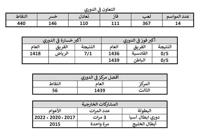 التعاون في الممتاز: استمر الفريق في دوري الأولى 17 عاماً قبل الصعود الأول في تاريخه وشارك لأول مرة في الممتاز موسم 1416 هبط بعدها بموسم ، وبعد الهبوط بموسم صعد مرة أخرى وشارك موسم 1418 ليعود أدراجه قبل الصعود الثالث والثابت موسم 1430 وشارك موسم 1431 ولازال يتواجد بين كبار الممتاز.