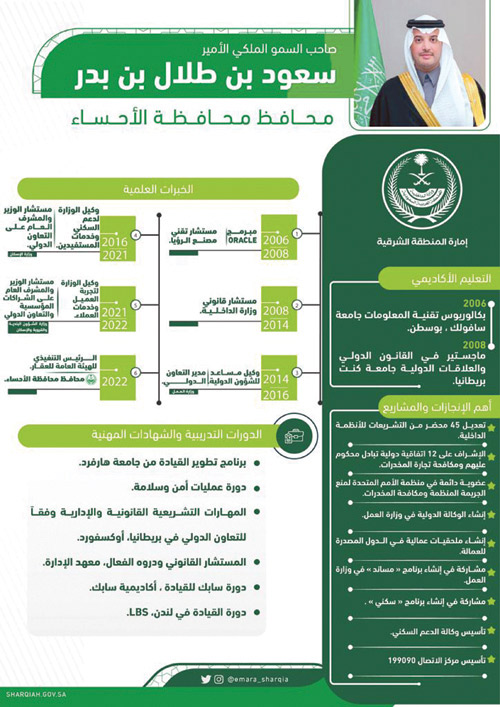 رفع صاحب السمو الملكي الأمير سعود بن طلال بن بدر محافظ الأحساء الشكر والعرفان لمقام خادم الحرمين الشريفين الملك سلمان بن عبدالعزيز -حفظه الله- على الثقة الملكية الكريمة بتعيينه محافظاً لمحافظة الأحساء.