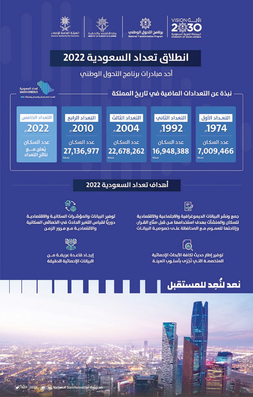 أطلق معالي وزير الاقتصاد والتخطيط رئيس مجلس إدارة الهيئة العامة للإحصاء الأستاذ فيصل بن فاضل الإبراهيم مرحلة العد الفعلي وجمع البيانات لبرنامج تعداد السعودية 2022م، التي صدرت الموافقة الكريمة بشأنها في سبتمبر الماضي. ورفع معاليه بهذه المناسبة أسمى آيات الشكر لخادم الحرمين الشريفين الملك سلمان بن عبد العزيز آل سعود، ولصاحب السمو الملكي الأمير محمد بن سلمان بن عبدالعزيز ولي العهد نائب رئيس مجلس الوزراء -حفظهما الله- على توجيهاتهما الكريمة، ودعمهما الكامل وغير المحدود للهيئة العامة للإحصاء لتنفيذ التعداد. وأشاد معاليه في كلمة ألقاها خلال الحفل الذي أقامته الهيئة العامة للإحصاء بالجهود الكبيرة التي بذلتها مختلف الجهات الحكومية في هذا المشروع الوطني، مشيراً إلى التحولات الشاملة التي شهدتها المملكة في ظل رؤية 2030، موضحاً أن الهيئة العامة للإحصاء سعت إلى توفير البيانات الإحصائية الدقيقة والموثوقة بصفتها ركيزة أساسية للتخطيط والتطوير، واتخاذ القرارات، ورسم السياسات الاقتصادية والاجتماعية، وتطوير الخطط التنموية لمختلف القطاعات؛بما يسهم في تحقيق مستهدفات الرؤية، والإعداد لمستقبل أفضل. وأكد معاليه أن الهيئة العامة للإحصاء اعتمدت على أعلى المعايير العالمية واستخدمت أحدث التقنيات والأساليب لإصدار البيانات الإحصائية، وذلك من خلال التكامل والدمج بين بيانات السجلات الإدارية المختلفة، والبيانات الضخمة (big data)، وبيانات التعداد الإحصائية، للخروج ببيانات دقيقة. وأوضح معالي وزير الاقتصاد والتخطيط رئيس مجلس إدارة الهيئة العامة للإحصاء أن تعداد السعودية 2022 يعد أول تعداد رقمي في تاريخ المملكة، ويشهد للمرة الأولى تطبيق ميزة العد الذاتي ضمن خيارات التعداد، مبيناً أن أكثر من 30 ألف باحث ميداني سيقومون بزيارة الأسر والمساكن لجمع المعلومات وفق أعلى درجات السرية والخصوصية، وذلك بتنسيق مباشر مع وزارة الداخلية، والأجهزة الأمنية، وإمارات المناطق، لضمان أمن وسلامة جميع المشاركين في التعداد. وأشاد بالمشاركة الواسعة للمرأة السعودية في مختلف أعمال التعداد سواءً من خلال المناصب القيادية التي تقلَّدتها أو من خلال الإسهام في الأعمال الميدانية، مؤكداً أن هذه المشاركة امتداد لنهج المملكة في تمكين المرأة وزيادة إسهاماتها في الاقتصاد الوطني، داعياً سكان المملكة إلى المشاركة في التعداد من خلال استيفاءالاستمارة الخاصة به عبر مختلف الخيارات المتاحة، حيث يُعدُّ ذلك واجباً وطنياً ومسؤولية اجتماعية، وفرصة للإسهام في مستقبل أفضل للمملكة.