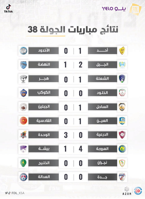 وتعادل المتصدر الخليج سلبياً مع نجران ليصل للنقطة 66 ويعلن صعوده بشكل رسمي ليحقق لقب بطولة الدوري؛ كما اكتفى العدالة بالتعادل السلبي مع مضيفه جدة ليصعد ثانياً بنفس الرصيد 66 نقطة؛ وحقق الوحدة الفوز على الدرعية بثلاثية نظيفة بعدما استفاد من تعثر صاحب المركز الثالث هجر الذي خسر من الشعلة 1-0 ليصل فرسان مكة الى 65 نقطة ويحصلون على بطاقة الصعود الثالثة.