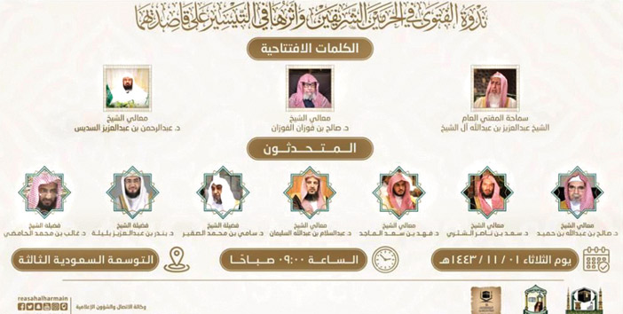 استكملت رئاسة الحرمين الشريفين استعداداتها لعقد الندوة الكبرى الأولى من نوعها في المسجد الحرام، تحت عنوان «الفتوى في الحرمين الشريفين»، وأثرها في التيسير على قاصديهما التي تنظمها رئاسة الحرمين بالتعاون مع الرئاسة العامة للبحوث العلمية والإفتاء الثلاثاء بالتوسعة السعودية الجديدة بالحرم المكي، بعد صدور الموافقة السامية لإقامتها، بحضور مستشار خادم الحرمين الشريفين سمو أمير منطقة مكة المكرمة، بهدف تأصيل الفتوى في الحرمين وفق المنهج الوسطي المعتدل، إلى جانب السعي لإرساء أسس قويمة للفتوى، بما يسهم في التيسير على القاصدين.
