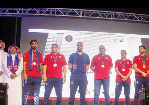 بعد ذلك دخل نجوم الفريق على مسرح الحفل واحداً تلو الآخر مع الجهازين الإداري والفني والطبي والمركز الإعلامي.