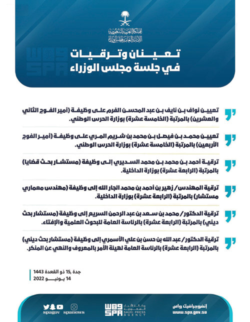 ــ تعيين نواف بن نايف بن عبدالمحسن الفرم على وظيفة (أمير الفوج الثاني والعشرين) بالمرتبة (الخامسة عشرة) بوزارة الحرس الوطني.