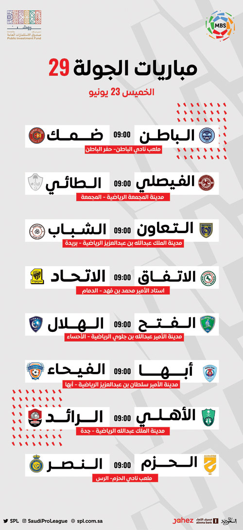 اليوم الخميس جولة قبل الختام وجولة ما قبل الحسم وجولة ينتظرها عشاق الكرة السعودية بفارغ الصبر بعد التأجيل وتبقي الأمور على أشدها، اليوم سنكون على موعد مثير بإقامة 8 لقاءات دفعة واحدة في نفس التوقيت وهي لقاءات الجولة التاسعة والعشرين والتي قد تحسم أمر البطل الذي انحصر بين الهلال والاتحاد، وقد نتعرف معها على هوية الهابطين لمرافقة الحزم في ظل، ولكن المتوقع أن تتأجل الأمور إلى الجولة الختامية.