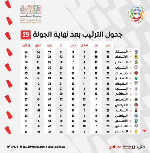 ليبتعد الباطن مؤقتًا عن مراكز الهبوط بعد أن رفع رصيده إلى 32 نقطة في المركز الثالث عشر، في حين تجمد رصيد ضمك عند 43 نقطة بالمركز الخامس.