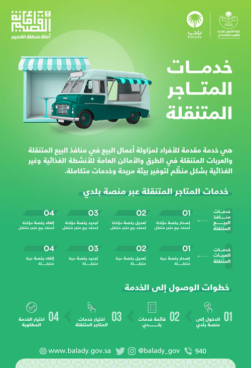 سعيًا من أمانة منطقة القصيم في دعم قطاع الأعمال، وتمكين الأفراد من مزاولة أعمال البيع.. أطلقت خدمات المتاجر المتنقلة عبر منصة «بلدي» التي تُمكّن الأفراد من إصدار رخصة لمنفذ بيع متجر متنقل، أو عربة متنقلة للأنشطة الغذائية وغير الغذائية؛ وذلك بهدف تنظيم عملية البيع في الأماكن العامة من خلال حاضنات الأعمال ومسارات العربات المتنقلة، والحرص على سلامة الزوّار، وخلق بيئة جاذبة.