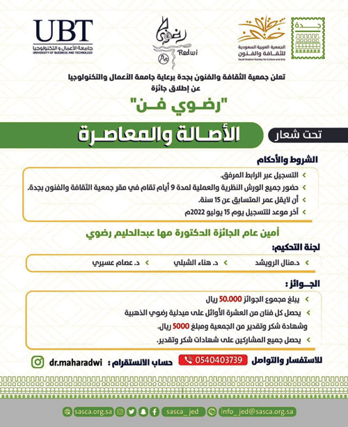 وتخليداً لذكرى رائد الفن التشكيلي السعودي الفنان التشكيلي الراحل عبدالحليم رضوي رحمه الله أطلقت الجمعية العربية السعودية للثقافة والفنون بجدة ورعاية جامعة الأعمال والتكنولوجيا (جائزة رضوي فن) في نسختها الأولى وبشعار «الأصالة والمعاصرة».