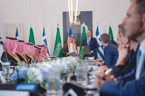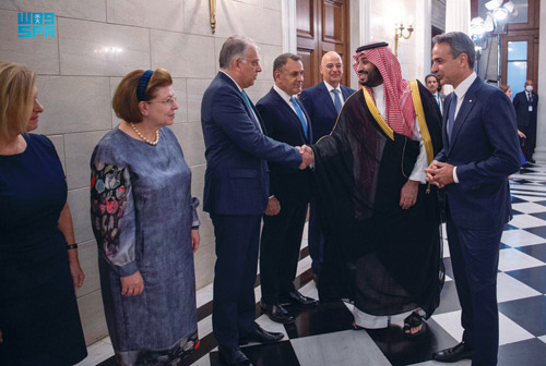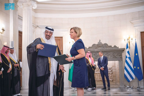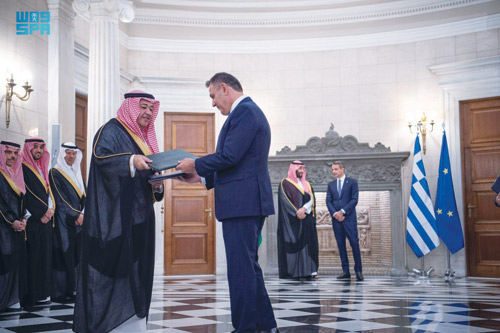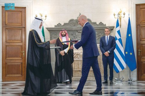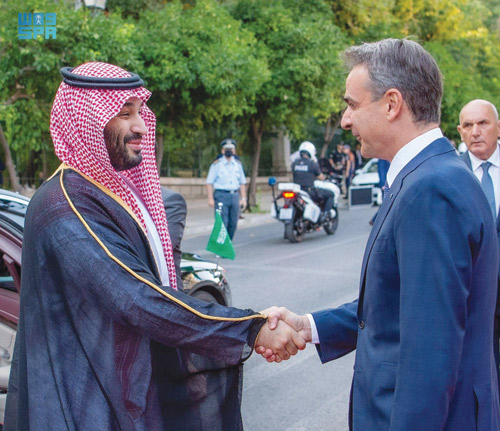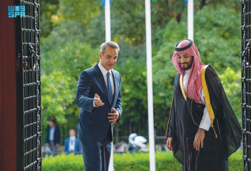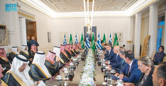 وقد شهد سمو ولي العهد ودولة رئيس الوزراء اليوناني توقيع اتفاقية إنشاء مجلس الشراكة الاستراتيجية السعودي اليوناني. كما شهد سمو ولي العهد ودولة رئيس الوزراء تبادل عدد من الاتفاقيات ومذكرات التفاهم الثنائية بين البلدين وهي: اتفاقية في مجال الطاقة، ومذكرة تفاهم للتعاون في مجال الرياضة، واتفاقية بشأن التعاون في مجال مكافحة الجريمة، واتفاقية حماية وتشجيع الاستثمار بين البلدين، ومذكرة تفاهم للتعاون في المجال الصحي، واتفاقية للتعاون في المجال العسكري، ومذكرة تفاهم في مجال التعاون العلمي والتقني، وبرنامج تعاون فني في مجالات المقاييس والجودة، واتفاقية تعاون في مجال الوثائق والأرشفة، واتفاقية الكيبل البحري. وكان قد وصل صاحب السمو الملكي الأمير محمد بن سلمان بن عبدالعزيز ولي العهد نائب رئيس مجلس الوزراء أمس إلى جمهورية اليونان. وكان في مقدمة مستقبلي سمو ولي العهد، لدى وصوله مطار أثينا الدولي، نائب رئيس الوزراء اليوناني السيد بيكرامينوس. وتوجه سمو ولي العهد في موكب رسمي إلى قصر ماكسيموس مقر رئاسة الوزراء في العاصمة اليونانية أثينا. ويضم الوفد الرسمي لسمو ولي العهد، صاحب السمو الملكي الأمير عبدالعزيز بن سلمان بن عبدالعزيز وزير الطاقة، وصاحب السمو الملكي الأمير عبدالعزيز بن تركي الفيصل وزير الرياضة، وصاحب السمو الأمير فيصل بن فرحان بن عبدالله وزير الخارجية، وصاحب السمو الأمير بدر بن عبدالله بن فرحان وزير الثقافة، ومعالي وزير الدولة عضو مجلس الوزراء مستشار الأمن الوطني الدكتور مساعد بن محمد العيبان، ومعالي وزير التجارة وزير الإعلام المكلف الدكتور ماجد بن عبدالله القصبي، ومعالي وزير الاستثمار المهندس خالد بن عبدالعزيز الفالح، ومعالي وزير الاتصالات وتقنية المعلومات المهندس عبدالله بن عامر السواحة، ومعالي محافظ صندوق الاستثمارات العامة الأستاذ ياسر بن عثمان الرميان. ويضم الوفد المرافق لسمو ولي العهد، معالي سكرتير سمو ولي العهد الدكتور بندر بن عبيد الرشيد، ومعالي نائب رئيس المراسم الملكية الأستاذ راكان بن محمد الطبيشي، وسفير خادم الحرمين الشريفين لدى جمهورية اليونان الدكتور سعد العمار.