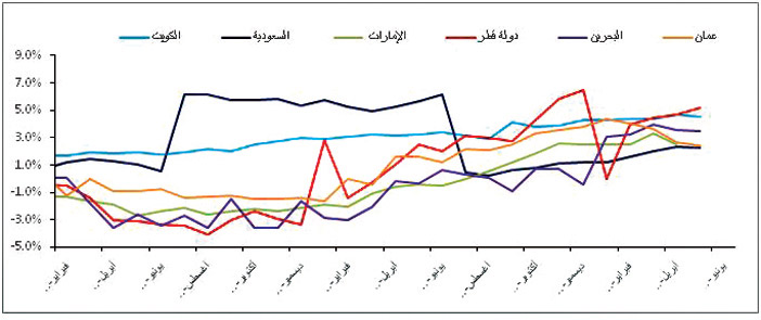 وكانت معدلات التضخم في دول مجلس التعاون الخليجي أقل بكثير من نظيراتها من الدول المتقدمة والناشئة. ويعزى نمو معدلات التضخم بوتيرة معتدلة في دول مجلس التعاون الخليجي بصفة رئيسية إلى تحسن النشاط الاقتصادي في المنطقة، حيث أدى ارتفاع أسعار النفط والغاز إلى إنعاش الخزائن الحكومية. وعلى الرغم من قيام دول مجلس التعاون الخليجي باستيراد نحو 90 في المائة من إمداداتها الغذائية، إلا أنها نجحت في تجنب اضطرابات سلسلة الإمدادات الغذائية المرتبط بالصراع الروسي -الأوكراني بصفة رئيسية من خلال تنوّع مصادر استيراد المواد الغذائية. بالإضافة إلى ذلك، أدى تحديد الحكومة للسقف الأعلى لزيادة أسعار المواد الغذائية الأساسية والوقود إلى حماية المستهلكين في دول مجلس التعاون الخليجي من الزيادات الحادة لتلك الفئات.