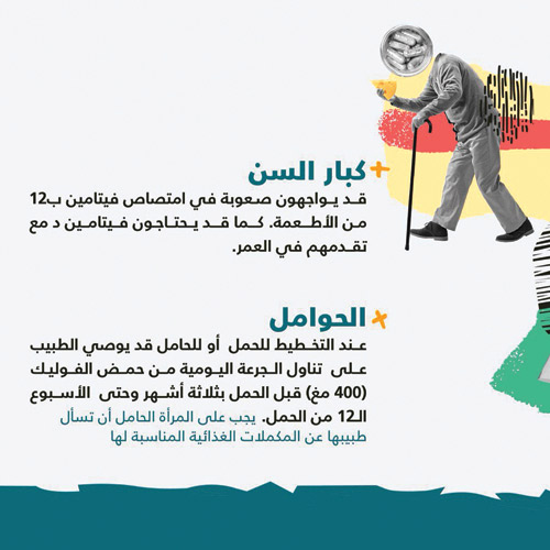 وحول من يتبع نظام غذائي نباتي فقد يحتاجون إلى مكملات فيتامين (ب 12) . وحول كبار السن أكد مجلس الصحة أنهم قد يواجهون صعوبة في امتصاص فيتامين (ب 12) من الأطعمة، كما قد يحتاجون كبار السن إلى فيتامين (د) مع تقدمهم في العمر.