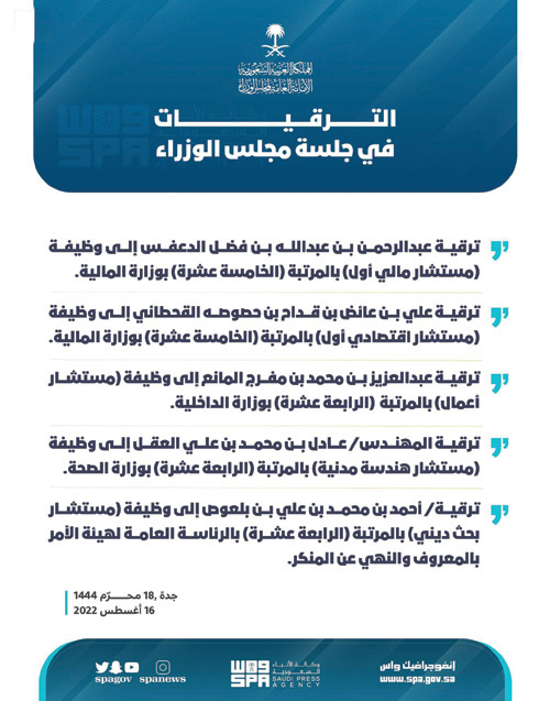 - ترقية عبد الرحمن بن عبد الله بن فضل الدعفس إلى وظيفة (مستشار مالي أول) بالمرتبة (الخامسة عشرة) بوزارة المالية.