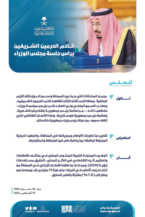 وقدّر مجلس الوزراء، الجهود المبذولة لتنمية المحتوى المحلي في مختلف القطاعات وتعظيم أثره الاقتصادي في الناتج المحلي، لتحقيق مستهدفات (رؤية 2030)، ومن ذلك ما حققه القطاع الزراعي من ارتفاع يُعد الأعلى في تاريخه؛ متجاوزاً 72 مليار ريال، وبمعدل نمو وصل إلى ( 7.8 في المئة ) مقارنة بالعام السابق. واطّلع المجلس، على الموضوعات المدرجة على جدول أعماله، من بينها موضوعات اشترك مجلس الشورى في دراستها، كما اطلع على ما انتهى إليه كل من مجلس الشؤون الاقتصادية والتنمية، ومجلس الشؤون السياسية والأمنية، واللجنة العامة لمجلس الوزراء، وهيئة الخبراء بمجلس الوزراء في شأنها. وقد انتهى المجلس إلى ما يلي: