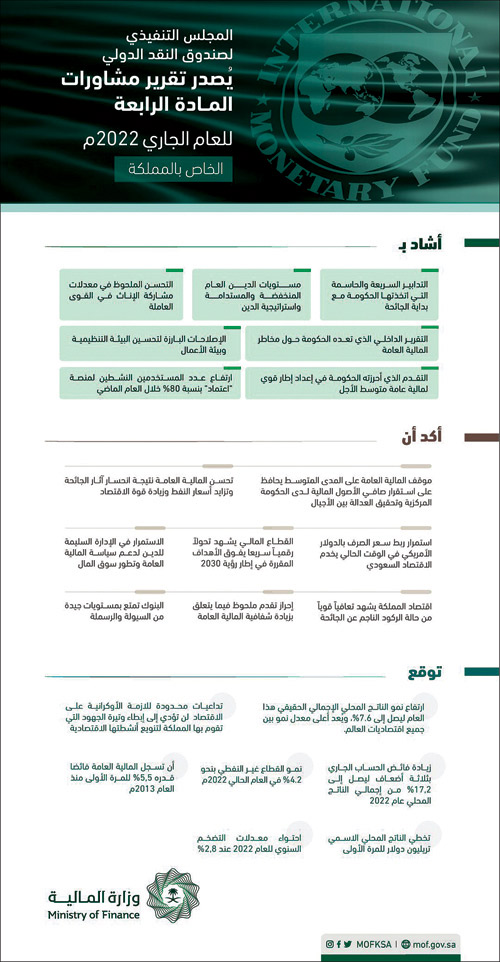 يُذكر أنه سبق أن أُصدِر بيان مبدئي عن بعثة خبراء صندوق النقد الدولي إثر اختتام مشاورات المادة الرابعة مع المملكة العربية السعودية لعام 2022م، التي جرت خلال شهر (أبريل 2022م)، ويأتي هذا البيان الختامي تأكيداً للنتائج المبدئية التي توصّل إليها البيان السابق.
