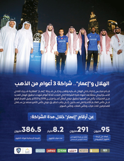 قدمت إدارة نادي الهلال شكرها لشركة إعمار العقارية، بعد انتهاء فترة الشراكة بين الطرفين التي استمرت لمدة ثلاث سنوات واستعرض الإنجازات التي حققها النادي خلال تلك الفترة، والتي حقق فيها الفريق الكروي بطولة دوري أبطال آسيا لعامي 2019 و2021،وبالتالي الحصول على المركز الرابع من بطولة كأس العالم للأندية بعد المشاركة في البطولة نتيجة لحصوله على اللقب القاري في تلك البطولتين، كما استطاع الفوز ثلاث مرات بلقب دوري كأس الأمير محمد بن سلمان للمحترفين، والتتويج بكأسي الملك والسوبر السعودي.والتي كان نتاج تلك الشراكة أن بلغت القيمة الإجمالية، للعوائد المالية التي حققها النادي من شراكته الاستراتيجية مع شركة إعمار العقارية مبلغ 386.5 مليون ريال، خلال ثلاثة أعوام، بحسب البيان الذي أعلنه النادي أمس.