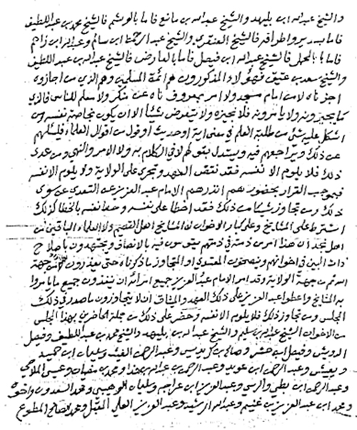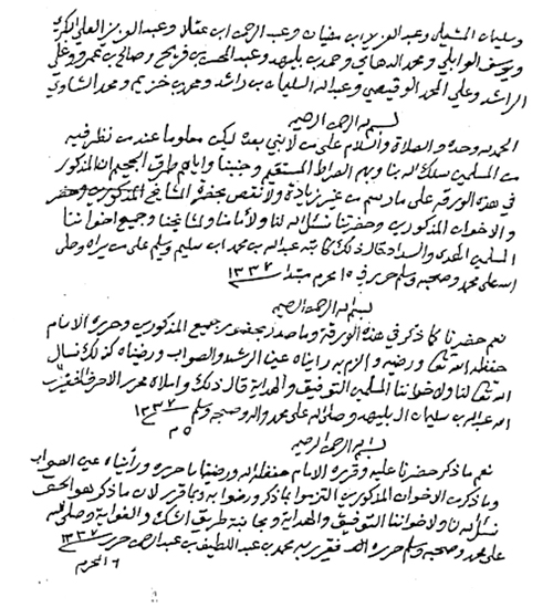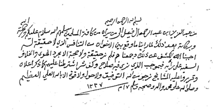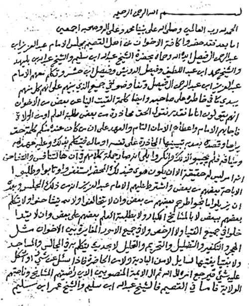سلام عليكم ورحمة الله وبركاته، بعد ذلك؛ لما رأينا ما وقع بين الإخوان من التنافس الذي لا حقيقة له أحببنا الكشف عن ذلك، جمعناهم فلم نر حقيقة ولا حجة إلا مجرد الهوى والخلاف السفيه على رأيه، فبموجب الذي نرى فيه صلاح وكف شر، اشترطنا عليهم كما ذكر أعلاه، وقرروا عليه المشايخ.