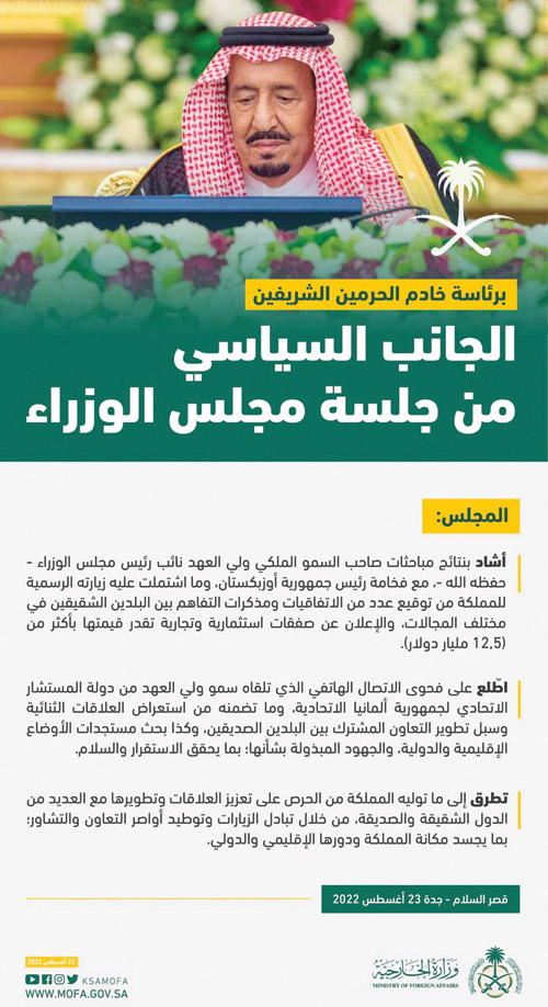 وأشاد المجلس في هذا السياق بنتائج مباحثات صاحب السمو الملكي ولي العهد نائب رئيس مجلس الوزراء - حفظه الله -، مع فخامة رئيس جمهورية أوزبكستان، وما اشتملت عليه زيارته الرسمية للمملكة من توقيع عدد من الاتفاقيات ومذكرات التفاهم بين البلدين الشقيقين في مختلف المجالات، والإعلان عن صفقات استثمارية وتجارية تقدر قيمتها بأكثر من (12,5 مليار دولار).