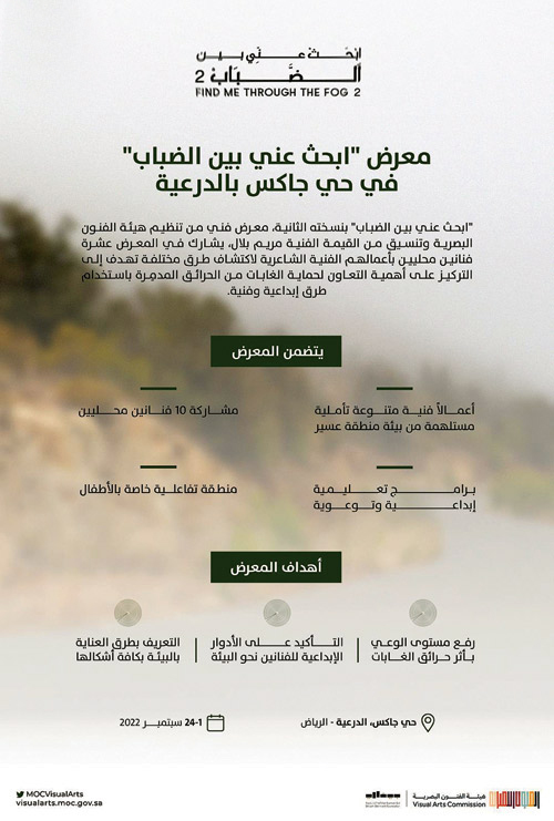 تنظّم هيئة الفنون البصرية النسخة الثانية من معرض «ابحث عني بين الضباب» خلال الفترة من 1 إلى 24 سبتمبر في حي جاكس بالدرعية التاريخية، الذي سيسلط الضوء على أهمية الاستدامة البيئية، وتعزيز سبل التوعية بأهمية المحافظة على الغابات من الحرائق عبر استخدام طرق فنية معاصرة.