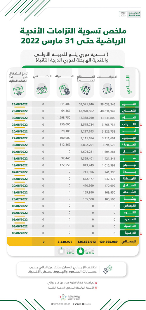 أعلنت لجنة الكفاءة المالية بوزارة الرياضة ما تم سداده من الالتزامات المالية واجبة السداد حتى تاريخ 31 مارس 2022م، لأندية دوري روشن السعودي ودوري يلو للدرجة الأولى والأندية الهابطة لدوري الدرجة الثانية في الموسم الرياضي الماضي.