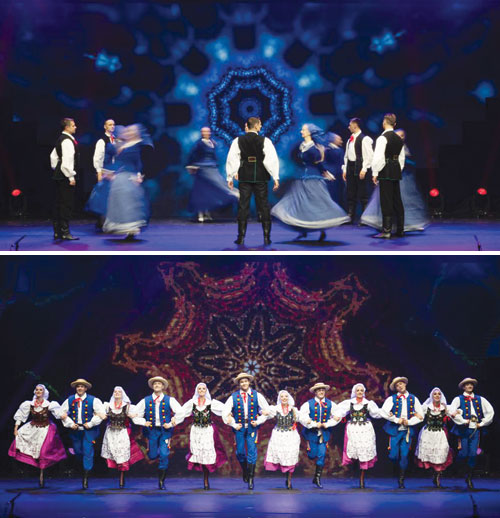 وقدم المؤدون الرقصات الوطنية البولندية والتي كان من ألوانها رقصة "كراكوفياك" الرومانسية المؤداة على وقع ألحان الموسيقار البولندي فريديريك فرانسوا شوبان، ورقصة "مازوركا" وهي إحدى رقصات "بولروم" المشهورة في أوروبا والمنقولة من أمريكا الشمالية، وتقوم هذا الرقصة على اتصال الزوجين باليد والتمايل جيئة وذهاب بطريقة هادئة تميل إلى لون "كراكوفياك"، أما رقصة " أوبيريك" الوطنية فتتسم بالرتم السريع والقفزات المتلاحقة، وتنوعت خلال العرض الرقصات المختلفة الممثلة لتراث وثقافة قرى بولندا القديمة.