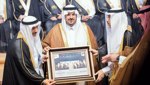 رعى صاحب السمو الملكي الأمير محمد بن عبدالرحمن بن عبدالعزيز أمير منطقة الرياض بالنيابة أمس حفل تخريج الدفعة الـ 13لجامعة رياض العلم في درجات البكالوريوس والدبلوم العالي والماجستير وشهادات الاختصاص في التخصصات الطبية بالتزامن مع مرور عشرين عاما على تأسيس الجامعة، وذلك في مركز الرياض الدولي للمؤتمرات والمعارض. وأعرب رئيس مجلس الأمناء لجامعة رياض العلم الدكتور عبدالله بن ركيب الشمري عن شكره وامتنانه لتشريف سمو أمير منطقة الرياض بالنيابة حفل الخريجين ومشاركتهم فرحتهم الغامرة مع أولياء أمورهم، منوهاً بما توليه القيادة الرشيدة من اهتمام بالغ بالتعليم في مجالاته كافة، ومنها التعليم الأهلي. وأكد إسهام الجامعة الفاعل في تعزيز التنمية والتطوير العلمي والتعليمي، مقدماً التهنئة للجميع على نجاحهم ووصولهم لهذه المرحلة، مشدداً على العزيمة في خدمة المهنة بالعلم والإخلاص. بعدها ألقيت كلمة الطلاب الخريجين، مشيرين إلى مكانة هذا اليوم الحافل بتحقيق نجاحهم التعليمي وبداية مسيرة جديدة من حياتهم، مقدمين شكرهم لأولياء أمورهم وأعضاء هيئة التدريس ومنسوبي الجامعة في وصولهم لهذا المستوى،آملين أن يقدموا بمختلف تخصصاتهم الطبية كل العون والخدمة في المهن الطبية وأعمالها النبيلة.كما تضمن الحفل فيلماً عن الجامعة وأداء القسم الطبي، وفي الختام تسلم سمو أمير منطقة الرياض هدية تذكارية بهذه المناسبة، وتم التقاط الصور التذكارية مع الخريجين.