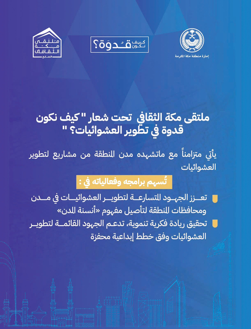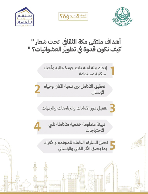 وأسهم ملتقى مكة الثقافي خلال دوراته السابقة بدعم أميرِ منطقة مكة المكرمة وسموِّ نائبه صاحبِ السموِّ الملكي الأمير بدر بن سلطان في تأصيل مفهوم القدوة وتطبيقاتها في مجتمع منطقة مكة المكرمة، فيما يستهدف هذا العام تحقيق مفهوم القدوة وتطبيقها في تطوير العشوائيات لبناء السلوك الصحيح وتنمية الخدمات وزيادة فاعلية مجتمع المنطقة، ولتحقيق ذلك تم تحديد 4 ركائز إستراتيجية تتمثل في تعزيز تطوير المدن وتخليصها من العشوائيات، وتفعيل دور المجتمع والأفراد بما يحقق الاستدامة، وتشجيع أنسنة المدن لأسلوب حياة أفضل، ودعم المبادرات التطويرية ذات الأثر المكاني والإنساني.