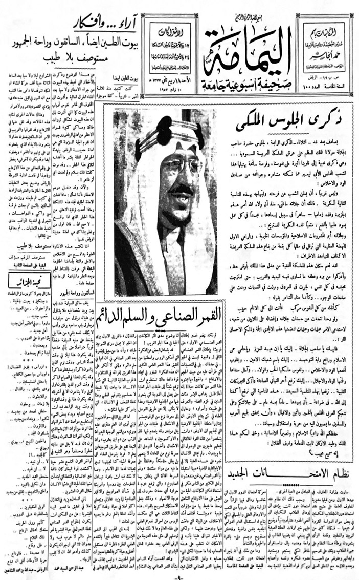 وسنورد مثالاً على «ذكرى الجلوس الملكي» للملك سعود، وهو الجلوس الرابع لجلالته بصحيفة اليمامة؛ حيث صادفت الذكرى يوم الثلاثاء 20 ربيع الثاني 1377هـ الموافق 12 نوفمبر 1957م، واحتفلت الصحيفة بهذه الذكرى قائلةً: «يصادف بعد غد - الثلاثاء - الذكرى الرابعة، لجلوس حضرة صاحب الجلالة مولانا الملك المعظم على عرش المملكة العربية السعودية وهي ذكرى محببة إلى قلوبنا أثيرة على نفوسنا، وفرصة سانحة يهتبلها هذا الشعب المخلص الأبيّ ليعبر عمَّا تكنه مشاعره وجوانحه من صادق الود والإخلاص!.... لقد نعم سكان هذه المملكة الفتية من عدل هذا الملك بأوفر حظ، وأدركوا من بره وعطفه ما تساوي فيه البعيد والقريب، حتى امتزجت محبته في كل نفس،... فإليك يا صاحب الجلالة.. إليك يا ابن عبد العزيز ويا حامي حمى الإسلام ورافع راية التوحيد... إليك باسم شعبك الأمين وبقلوب أفعمها الود والإخلاص.. ونفوس ملكها الحب والولاء.. وآمال سداها ولحمتها الوفاء والإجلال ... إليك نرفع أحر التهاني الصادقة وأزكى التبريكات القلبية.. نرفعها بهذه المناسبة السعيدة هذه المناسبة التي نرفع أكفنا إلى في ضراعة - بأن يعيدها - عاماً بعد عام - على جلالتكم وعلى شعبكم العربي المخلص بالخير واليمن والإقبال...»، «ذكرى الجلوس الملكي»، صحيفة اليمامة، (الأحد، 18 ربيع الثاني، 1377هـ الموافق 10 نوفمبر، 1957م)، العدد (100).