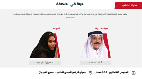 ويقدم المعرض في برنامجه الثقافي نخبة من الكتاب والمؤلفين الذين سيتحدثون للزوار عن مؤلفاتهم عبر سلسلة لقاءات «حديث الكتاب»، إضافة إلى الندوات والمحاضرات الثقافية، والجلسات الحوارية التي تستضيف المفكرين والمبدعين في مختلف الموضوعات.