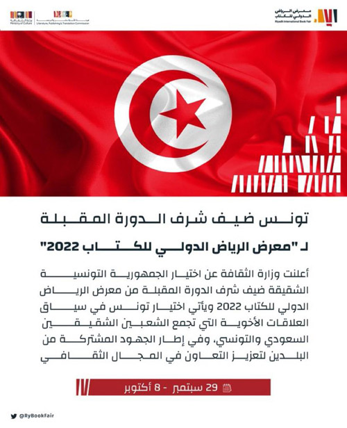 ويحتفي المعرض بالثقافة التونسية -ضيف شرف معرض الرياض الدولي للكتاب 2022- عبر جملة من الفعاليات في التراث والثقافة التونسية، حيث تستضيف كبار المفكرين والأدباء والمثقفين، والمختصين في الثقافة والتراث التونسي، إضافة إلى حفلات غنائية يصافح من خلالها فنانون تونسيون جماهيرهم ومحبيهم، كما سيقدم شعراء تونسيون إبداعهم الشعريّ في فضاء المعرض.