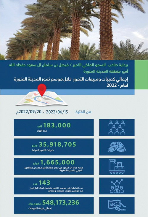 وبلغ إجمالي كميات التمور المباعة خلال فعاليات موسم التمور 35.918.705 كجم, فيما بلغت كمية صادرات التمور من محجر مطار الأمير محمد بن عبدالعزيز الدولي بالمدينة 1.665.000 كجم, وبلغ إجمالي قيمة المبيعات 548.173.236 مليون ريال، وشهد الموسم إقبالًا كبيرًا من الزوار الذين بلغ عددهم 183.000 زائر.