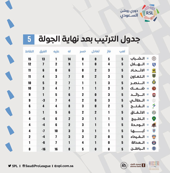 انفرد الفريق الشبابي بصدارة دوري روشن بالعلامة الكاملة بعد تحقيقه الفوز الخامس على التوالي على حساب الفيحاء 2 / 1 في المجمعة، وفي الرياض تلقى الهلال أول خسارة بهدفين مقابل هدف للتعاون، وانتهى الكلاسيكو الذي جمع النصر والاتحاد على ملعب مرسول بارك بالتعادل السلبي بدون أهداف في مباراة شهدت العديد من البطاقات الملونة وطرد لاعب من كل فريق.وفي الأحساء كسب الفتح أبها بثلاثية دون مقابل.