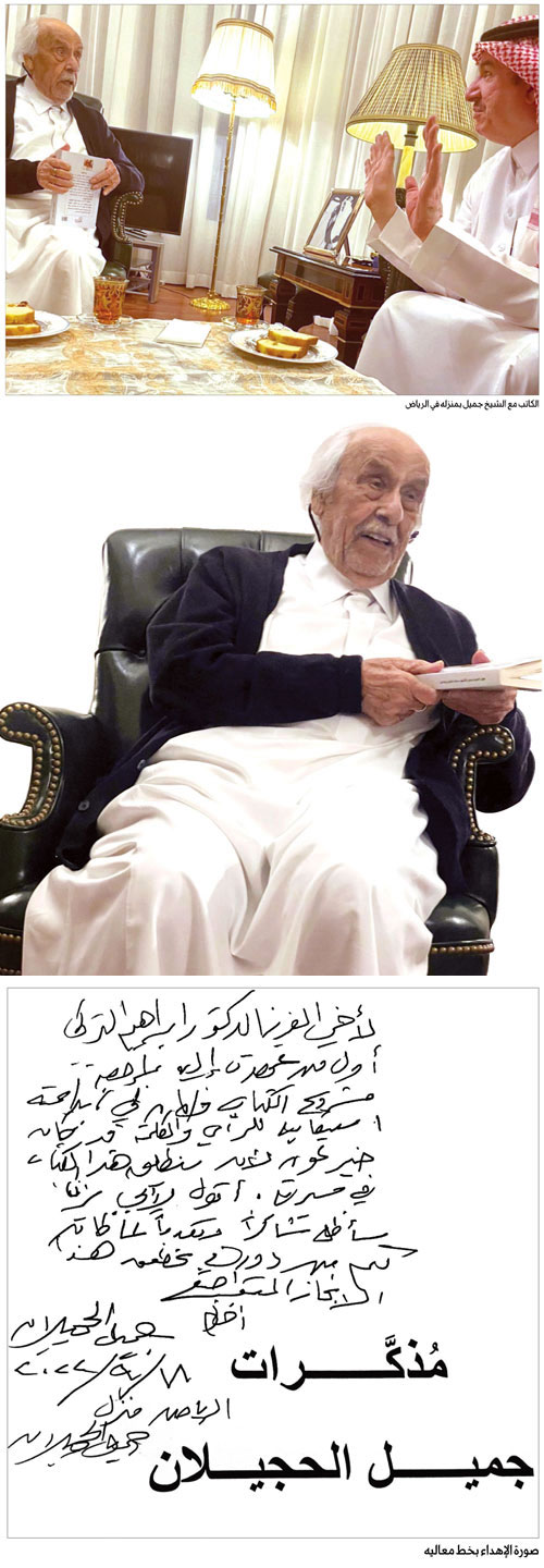 - أما السيرةُ الثانيةُ التي ما فتئَ الحديث عنها متداولًا فهي سيرة معالي الشيخ جميل الحجيلان حفظه الله، وسنقررُ مع من عايشَ كتابةَ هذه السيرة أنها استغرقتْ أكثر من عشرة أعوامٍ في المراجعة والإضافة والتعديل والإعداد للنشر، وما نزال ننتظرها في كل موسمٍ من مواسم معارض الكتاب، وإذا كنا قد تباطأناها فإننا - في الوقت نفسه - سنلوم المتعجلين بإصدار سيرٍ باهتةٍ لا لون لها ولا دلالة فيها أكثرَ من إضفاء هالات التميز على الأنا، أما أستاذنا أبو عماد فدقيقٌ مدقق، وثقةٌ موثِّق، وسيرتُه ليست تأريخَ عَلَمٍ ذي شأنٍ، ورمزٍ ذي مكانة فحسب؛ بل هي - فوق هذا- سيرةُ وطنٍ وأمةٍ في مرحلة من أهم مراحل التأريخ المحلي والعربي منذ خمسينيات القرن الماضي حتى مطلع الألفية الثالثة، ولو حسبناها وظيفيًا لقاربت سبعين عامًا، أما عمريًا - أطال الله عمره - فقرنٌ مورقٌ بالغربة والتحدي، والعمل والأمل، والعطاء والإباء، والإدارة والإعلام، والدبلوماسية والإنسانية.
