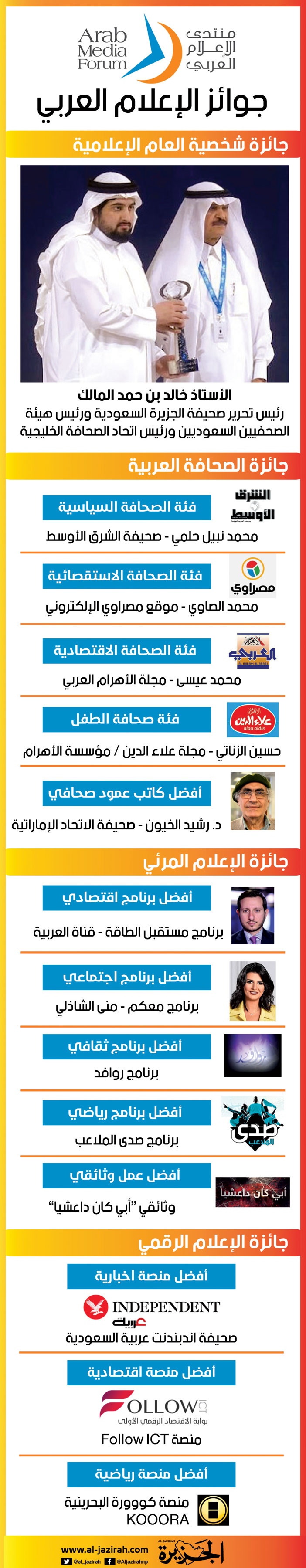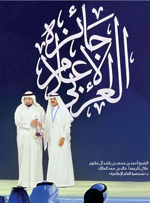 تحت رعاية الشيخ محمد بن راشد آل مكتوم؛ نائب رئيس دولة الإمارات العربية المتحدة رئيس مجلس الوزراء حاكم إمارة دبي، كرّم سمو الشيخ أحمد بن محمد بن راشد آل مكتوم، رئيس مجلس دبي للإعلام، الأستاذ خالد بن حمد المالك، رئيس تحرير صحيفة الجزيرة السعودية ورئيس هيئة الصحفيين السعوديين ورئيس اتحاد الصحافة الخليجية، الفائز بجائزة شخصية العام الإعلامية، وذلك خلال تسليم جوائز الإعلام العربي، في دورتها الحادية والعشرين.