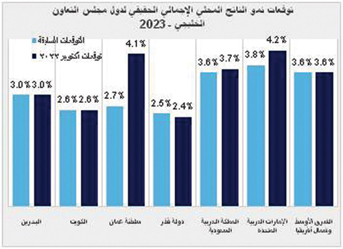 بالنسبة لعام 2023، ظلت توقعات الناتج المحلي الإجمالي الحقيقي لمنطقة الشرق الأوسط وشمال إفريقيا دون تغيير عند 3.6 في المائة بينما كانت هناك بعض المراجعات في توقعات النمو لبعض دول مجلس التعاون الخليجي. ومن المتوقع أن تشهد البحرين والكويت معدلات نمو للناتج المحلي الإجمالي عند 3.0 في المائة و 2.6 في المائة، على التوالي، بينما من المتوقع أن تشهد قطر أبطأ نمو في دول مجلس التعاون الخليجي العام المقبل عند 2.4 في المائة. من ناحية أخرى، من المتوقع أن تشهد الإمارات العربية المتحدة أسرع نمو للناتج المحلي الإجمالي بنسبة 4.2 في المائة تليها عمان بنسبة 4.1 في المائة (بعد مراجعة تصاعدية قدرها 110 نقاط أساس) والمملكة العربية السعودية بنسبة 3.7 في المائة.
