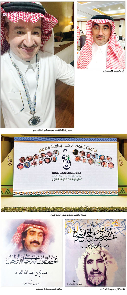 - اقتعد الأستاذ ناصر بن عبدالله العوّاد - صاحبُ المؤسسة ومُوقفُ شطرِ ماله عليها - أمكنةً قصيةً يوم الاحتفال وليلته وفي جميع مناشطه، فقد كان يتفقدُ ضيوفَه ويُنظّمُ الخِدمات لهم، ولم تعنِه صورتُه بل صيته، ولم ينشغلْ بموقعه بل بإيقاعه، وقدَّم أنموذجًا لما يمكنُ أن تتجهَ إليه الأوقاف؛ فتكريمُ الأحياء، وتزويجُ الضعفاء، وما قبلهما وما بعدهما سُبلُ بذلٍ تُكملُ سبلًا وتهدي إلى سُبل؛ ف «اللهم أعطِ منفقًا خلفا».