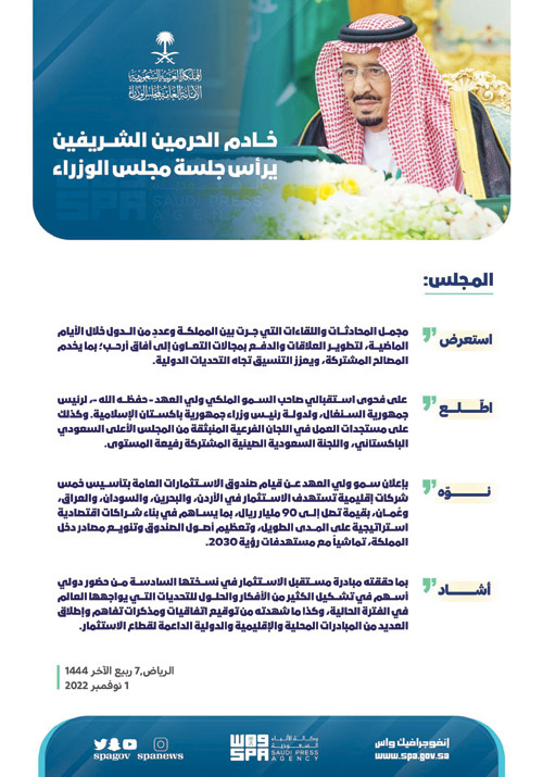 وأشاد المجلس، بما حققته مبادرة مستقبل الاستثمار في نسختها السادسة من حضور دولي أسهم في تشكيل الكثير من الأفكار والحلول للتحديات التي يواجهها العالم في الفترة الحالية، وكذا ما شهدته من توقيع اتفاقيات ومذكرات تفاهم وإطلاق العديد من المبادرات المحلية والإقليمية والدولية الداعمة لقطاع الاستثمار. واطّلع مجلس الوزراء، على الموضوعات المدرجة على جدول أعماله، من بينها موضوعات اشترك مجلس الشورى في دراستها، كما اطلع على ما انتهى إليه كل من مجلس الشؤون الاقتصادية والتنمية، ومجلس الشؤون السياسية والأمنية، واللجنة العامة لمجلس الوزراء، وهيئة الخبراء بمجلس الوزراء في شأنها. وقد انتهى المجلس إلى ما يلي: