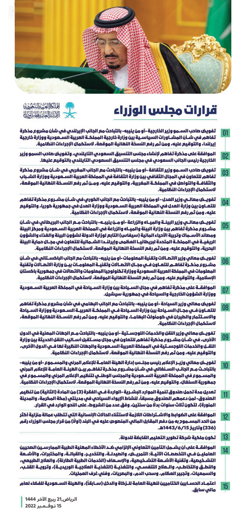 واطّلع مجلس الوزراء، على الموضوعات المدرجة على جدول أعماله، من بينها موضوعات اشترك مجلس الشورى في دراستها، كما اطلع على ما انتهى إليه كل من مجلس الشؤون الاقتصادية والتنمية، ومجلس الشؤون السياسية والأمنية، واللجنة العامة لمجلس الوزراء، وهيئة الخبراء بمجلس الوزراء في شأنها. وقد انتهى المجلس إلى ما يلي: