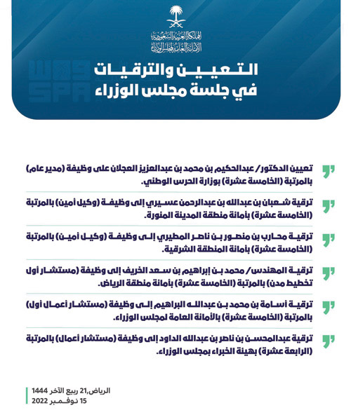 - ترقية أسامة بن محمد بن عبدالله البراهيم إلى وظيفة (مستشار أعمال أول) بالمرتبة (الخامسة عشرة) بالأمانة العامة لمجلس الوزراء.