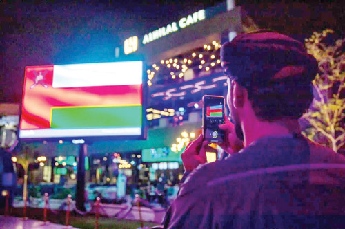 وتحولت شاشات «سكوير» في بوليفارد رياض سيتي إلى عرض بصري يحتفي بقيادة المملكة والسلطنة، كما تزينت النافورة وإضاءات البوليفارد بألوان علم عمان؛ تأكيدًا لمدى ما تحمله المناسبة من مكانة الشعبين وما تمثله من ذكرى مجيدة للعديد من المواقف التي سطرها التاريخ وتوثقت أواصرها بالتلاحم والأخوة.