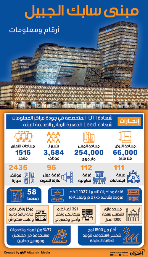 يعد مبنى «سابك» في الجبيل أنموذجاً حديثاً لمقرات الشركات بإمكانات متنوعة، وتبلغ مساحة البناء الإجمالية للمبنى 254 ألف متر مربع، على أرض مساحتها 66 ألف متر مربع، بمساحة استيعابية تتسع لأكثر من 3600 موظف، وقد تم بناؤه بالكامل من حديد سابك، كما تم الاعتماد على المحتوى المحلي في 77 في المائة من مشتريات المبنى، شملت الأعمال الميكانيكية والكهربائية وأعمال التشطيب.