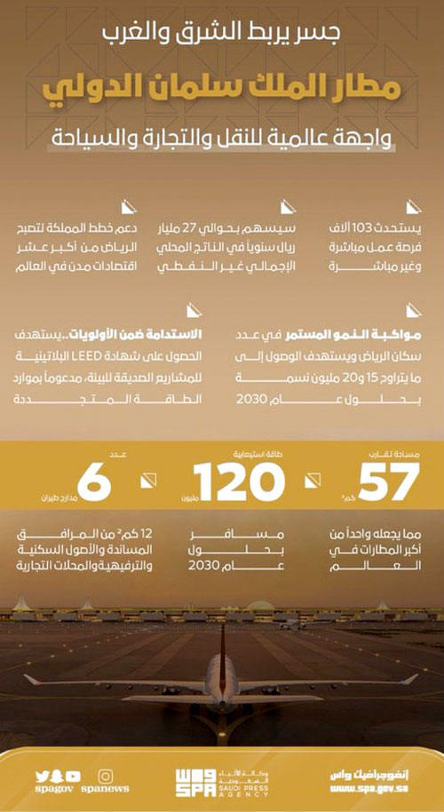 أعلن صاحب السمو الملكي الأمير محمد بن سلمان بن عبد العزيز آل سعود، ولي العهد رئيس مجلس الوزراء رئيس مجلس الشؤون الاقتصادية والتنمية رئيس مجلس إدارة صندوق الاستثمارات العامة - حفظه الله -، عن إطلاق المخطط العام لمطار الملك سلمان الدولي، لتكون الرياض بوابة للعالم، ووجهة عالمية للنقل والتجارة والسياحة، وجسراً يربط الشرق والغرب بما يرسخ مكانة المملكة كمركز لوجستي عالمي. وسيسهم المطار الجديد في دعم خطط المملكة لتكون مدينة الرياض ضمن أكبر عشر اقتصادات مدن في العالم، ولمواكبة النمو المستمر في عدد سكان العاصمة الرياض الذي يستهدف الوصول إلى ما يتراوح 15 و20 مليون نسمة بحلول عام 2030.