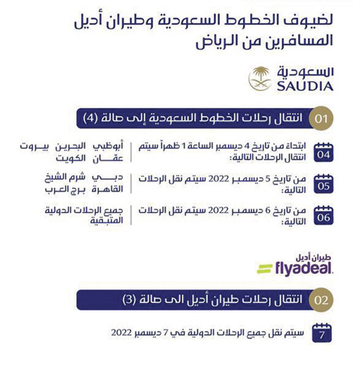 أتمت مجموعة الخطوط السعودية جاهزيتها لانتقال تشغيل كافة رحلاتها الدولية من مطار الملك خالد الدولي بالرياض عبر صالتي السفر 3 و 4، حيث ستبدأ عملية الانتقال التدريجي لرحلات الخطوط السعودية عبر صالة 4 اعتباراً من اليوم الأحد، بينما سيتم اعتباراً من يوم الأربعاء 7 ديسمبر انتقال جميع رحلات طيران أديل عبر صالة 3، وتتم كافة المراحل بالتنسيق مع مختلف الجهات العاملة بالمطار لضمان انسيابية العمليات التشغيلية.