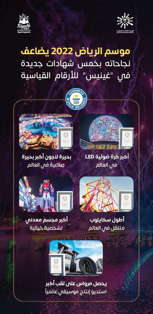 ضمن سلسلة نجاحاته المتوالية وفعالياته المتجددة والجذابة، حقق موسم الرياض 2022 خمسة أرقام جديدة في موسوعة «غينيس» للأرقام القياسية، إذ حصد الرقم القياسي بتسجيل بحيرة «لاجون» في منطقة «بوليفارد وورلد» بوصفها أكبر بحيرة صناعية في العالم، بمساحة تبلغ 12.19 هكتارًا، أي ما يساوي (30.13) فدانًا.